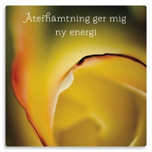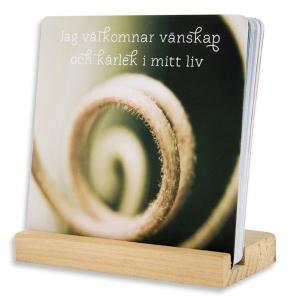Innehåll i lådan: 36 affirmationskort med tryck på fram- och baksida, en instruktion och en hållare i trä som rymmer alla korten. Korten är 11 x 11 cm av laminerad kartong.